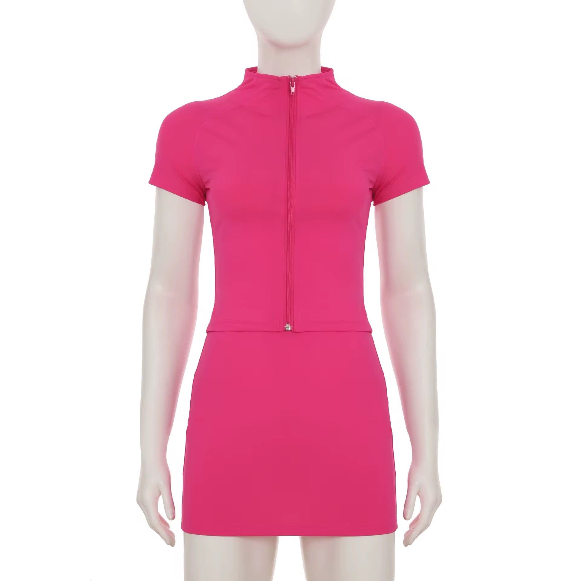 This Hot Pink Skirt Set is designed with a fitted zip-up short sleeve top and matching skirt, both made from athletic material. The perfect blend of fashion and function, this set provides comfort and style for any occasion.