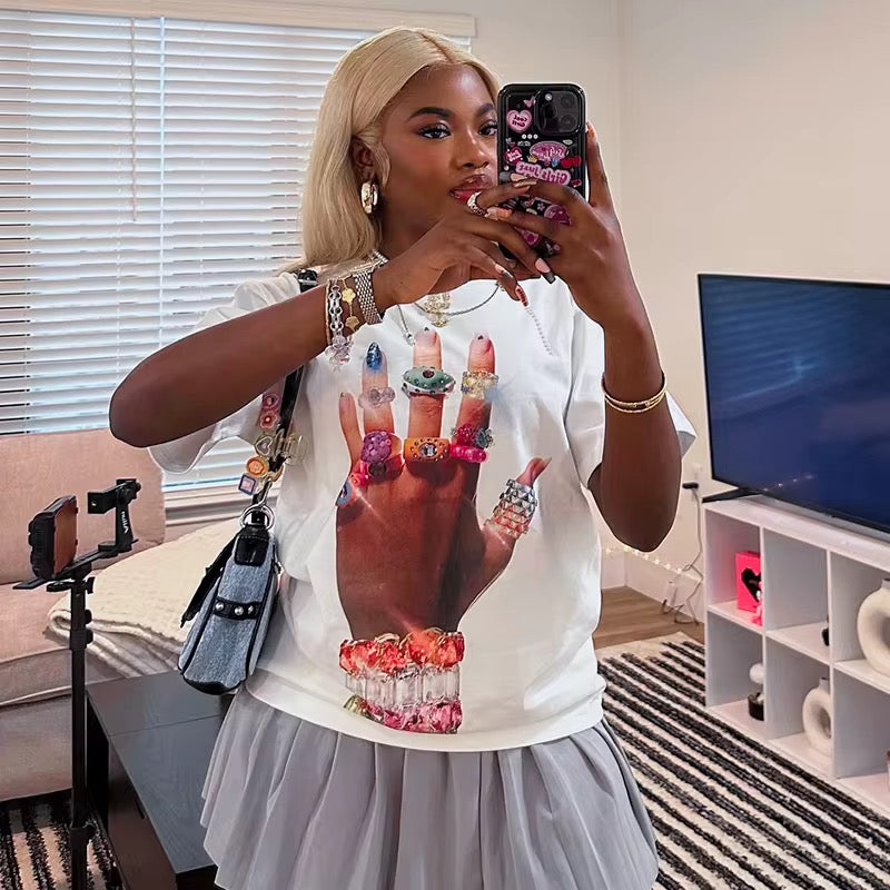"Get your groove on with the "Jazz Hand" top. This oversized white t-shirt features a cool image of a hand adorned with tons of jewelry. Show off your unique style and add some bling to your wardrobe. Perfect for any music lover or fashionista. (Wordplay intended.)"