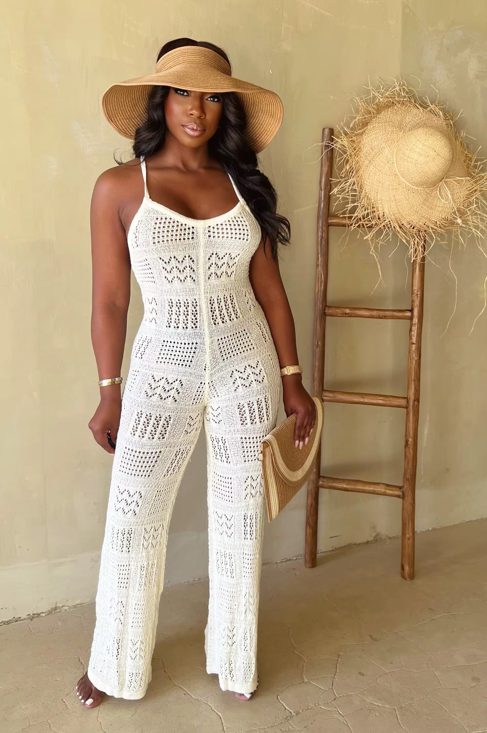 Get ready to lounge in style with our Knit Pants Outfit! This one piece features a classic white knit with delicate spaghetti straps. Perfect for a chic and classy look while still feeling comfortable. Knit your way to fashion with this unique and playful outfit.