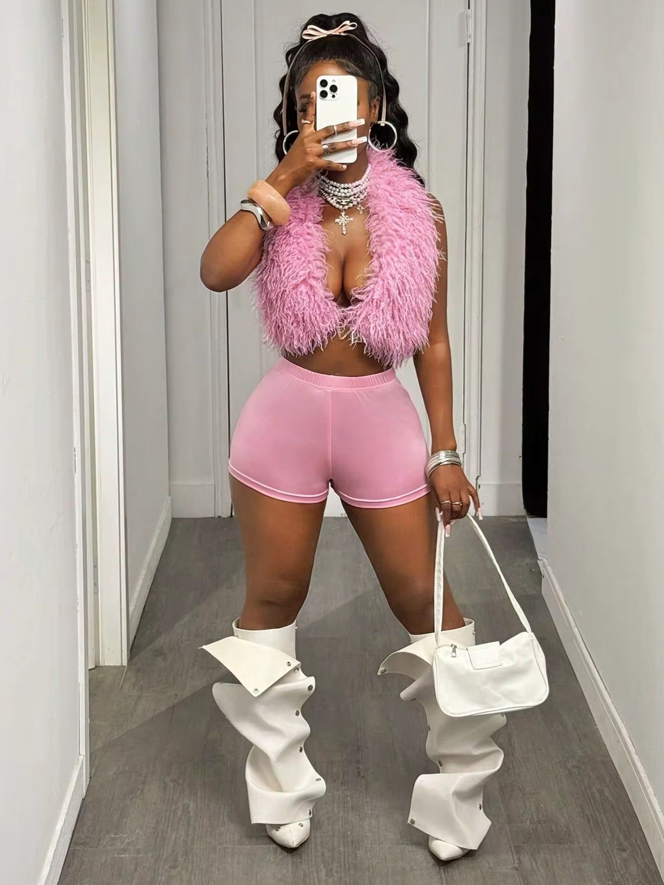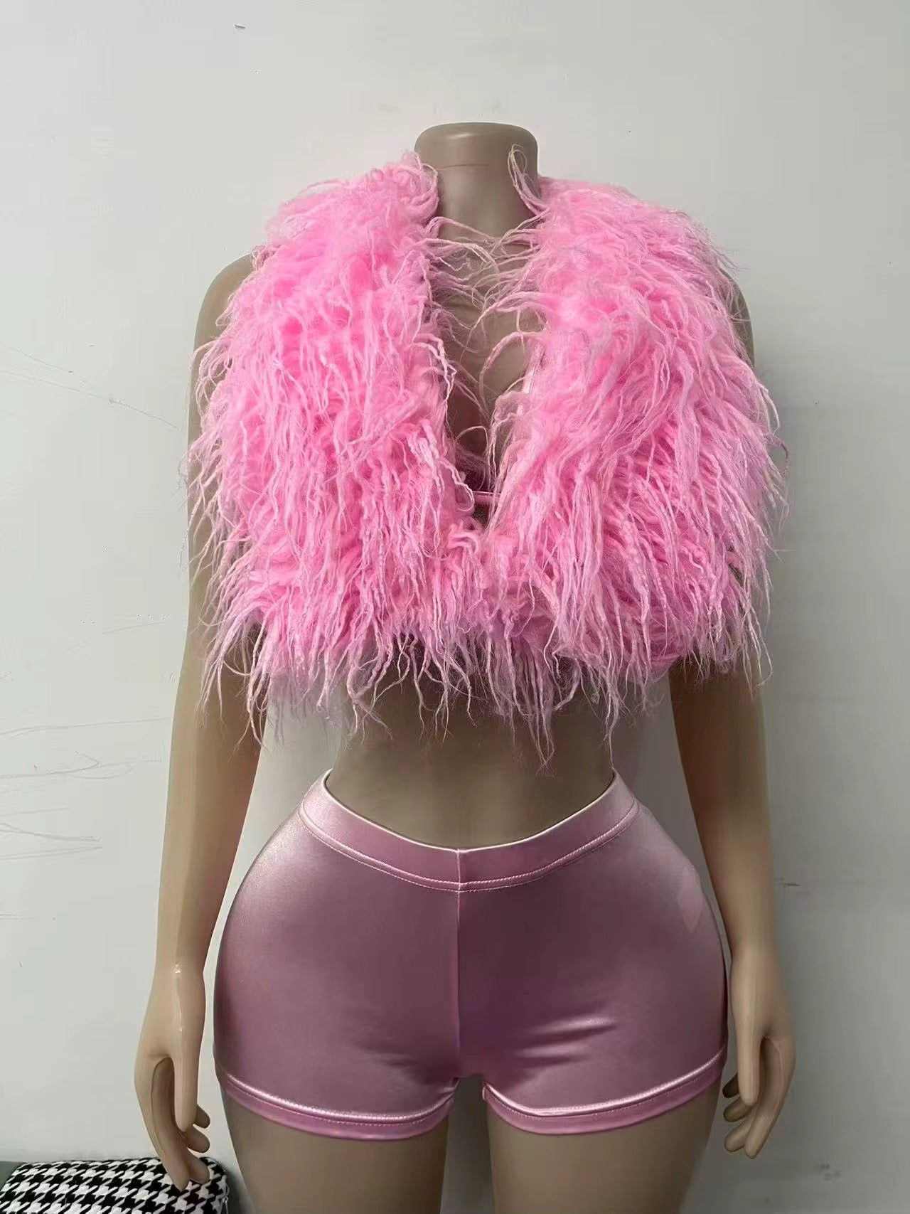 Get ready to steal the show with the “Showtime” Set. This head-turning set includes a flirty pink feather top with a v-neck and satin booty shorts. Perfect for a night out or a sultry performance, this set will make you feel confident and glamorous. Be the center of attention with the "Showtime" set!